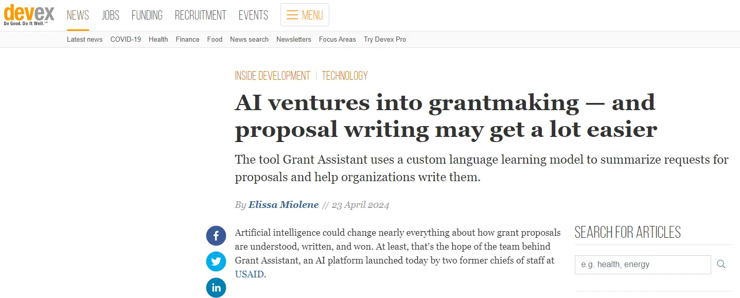 "AI ventures into grantmaking — and proposal writing may get a lot easier" - Devex